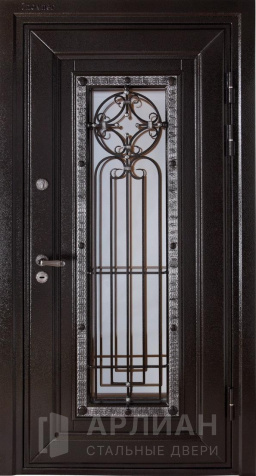 Входная коричневая дверь в частный дом со стеклопакетом и ковкой №11